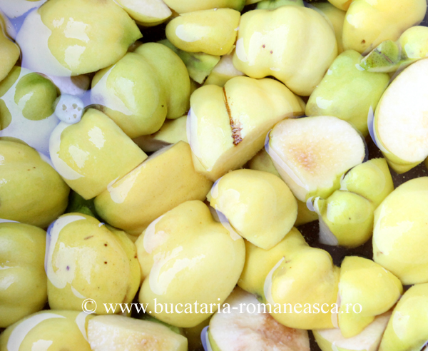 Se aleg gutui mici si galbene, se sterg de puf, le spalam si le taiem in bucati potrivite.