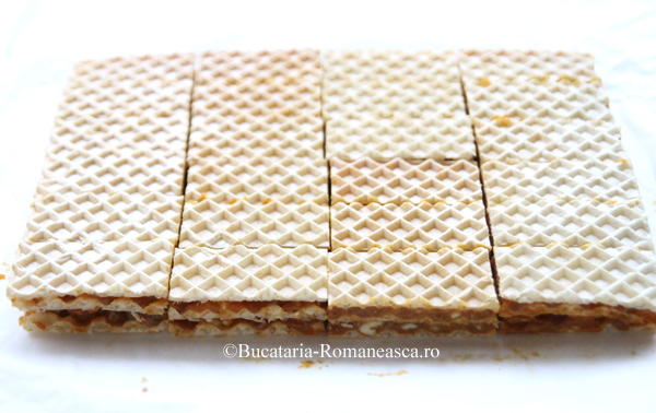 Intindem restul de crema si asezam ultima foaie de napolitana deasupra.