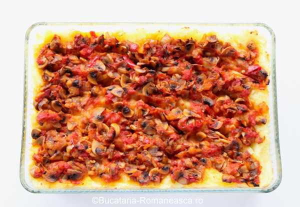 Deasupra am adaugat compozitia de ciuperci cu sos de rosii. Am nivelat bine compozitia.