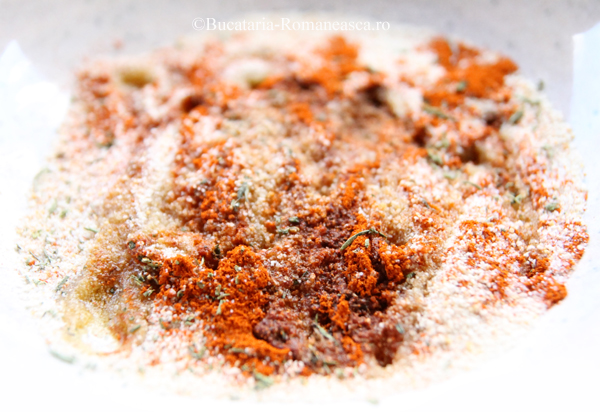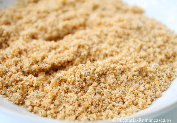 Intr-un bol, amestecam pesmetul cu boiaua, praful de usturoi, cimbrul, restul de ulei, sare si piper.