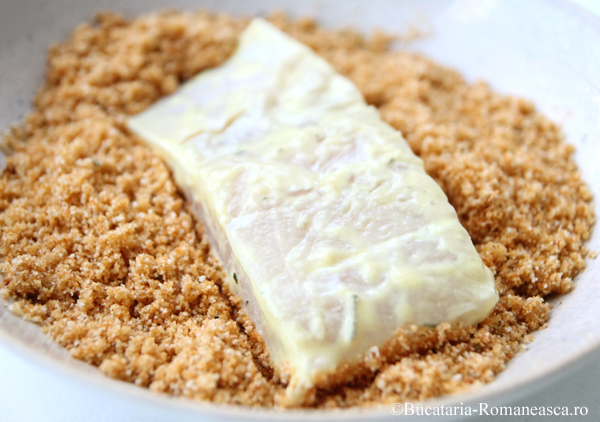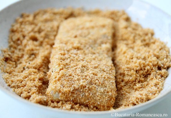 Tavalim fiecare bucata de peste prin acest amestec, presand usor pentru ca pesmetul sa se prinda uniform.