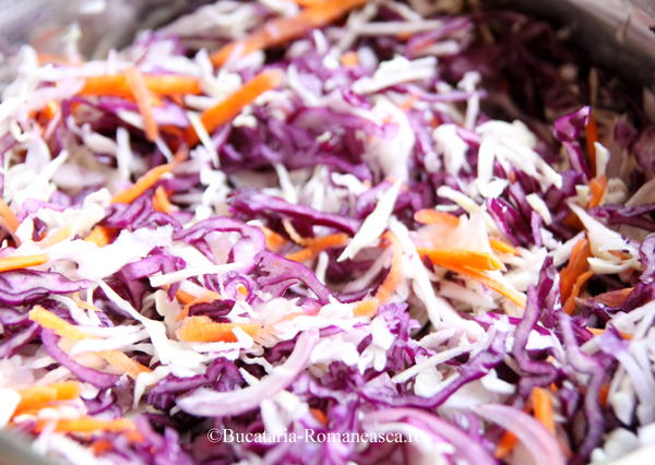 400 gr varza alba, 200 gr salata rosie, 1 morcov, 1 ceapa rosie, 100 gr maioneza, 100 gr iaurt grecesc, 1 lingurita mustar, 1 lingurita otet, sare si piper dupa gust.