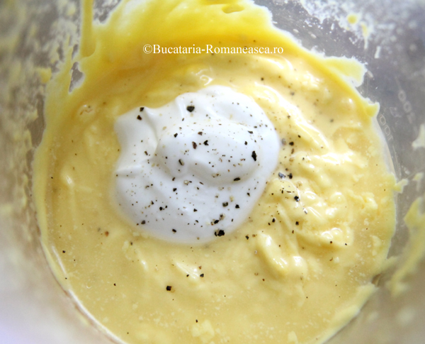 Intr-un bol, amestecam maioneza cu iaurtul grecesc, mustarul si otetul. Potrivim de sare si piper.